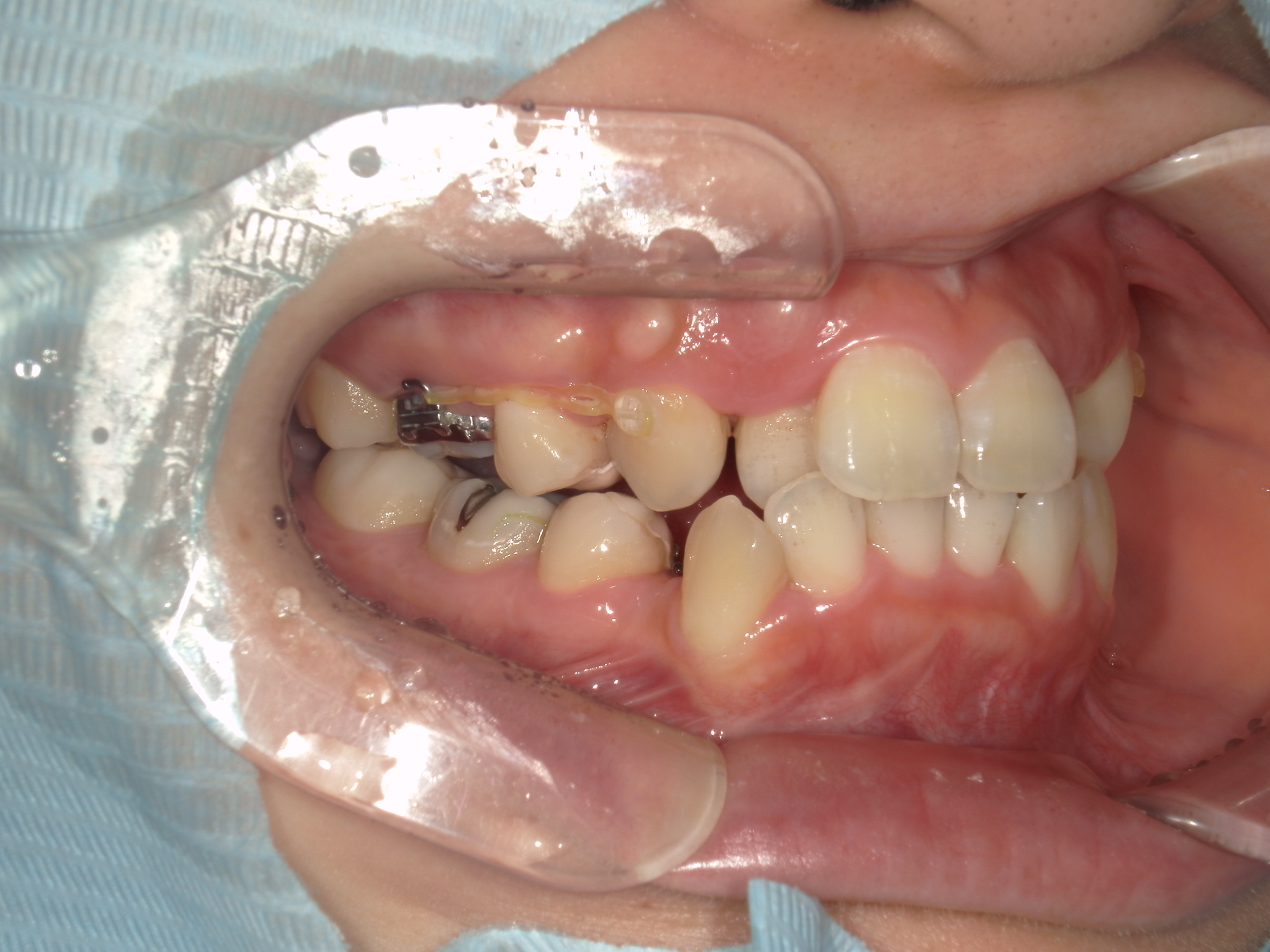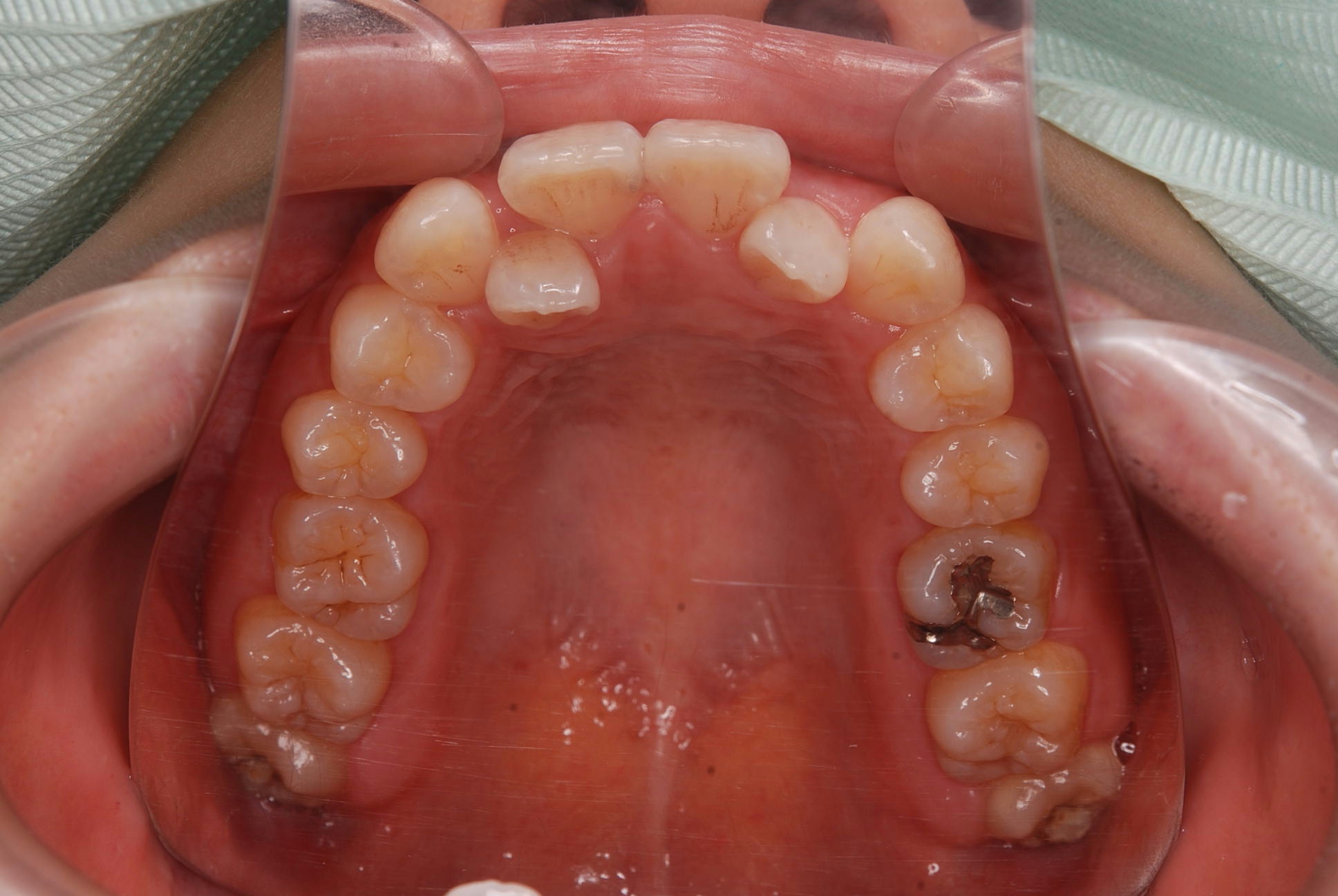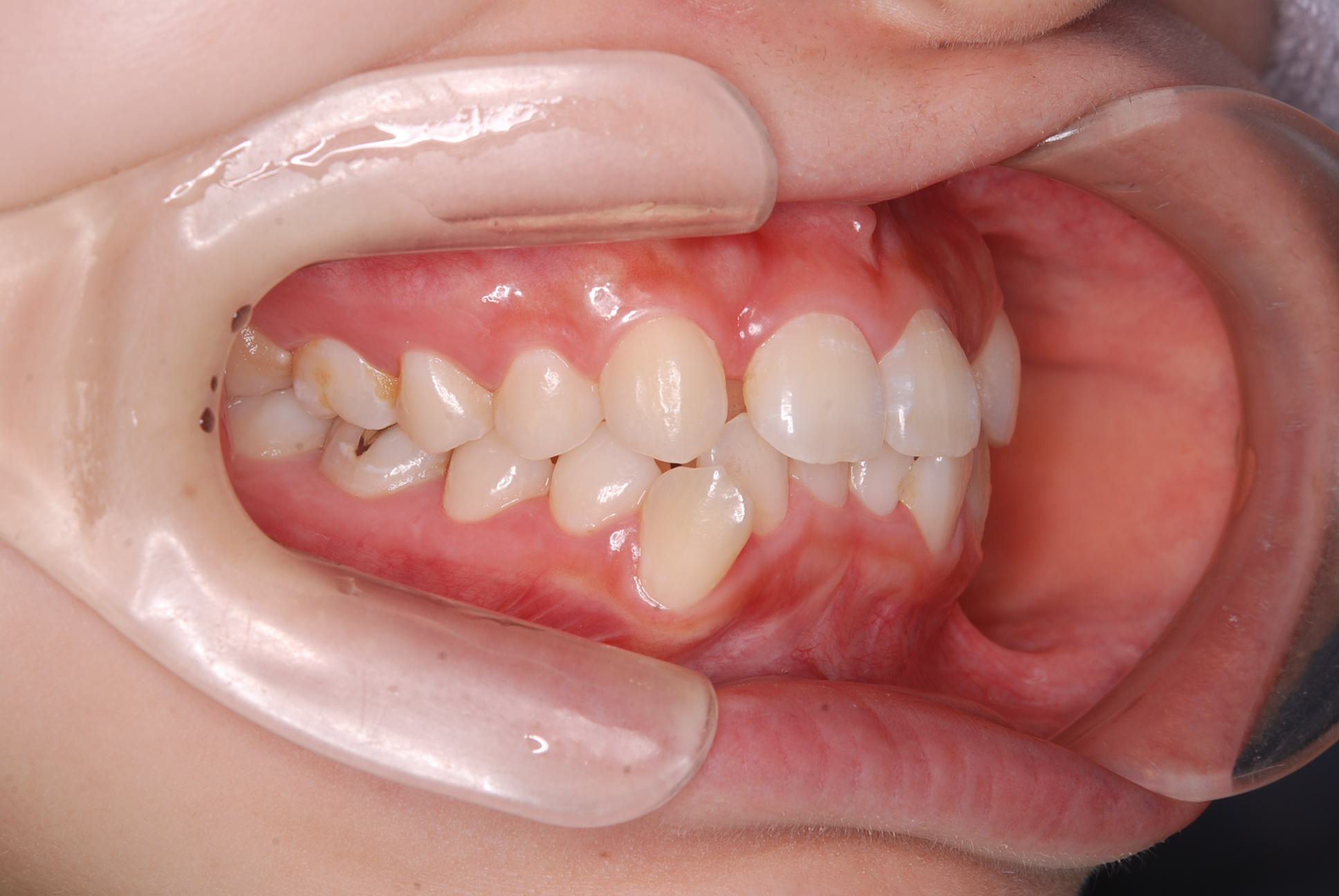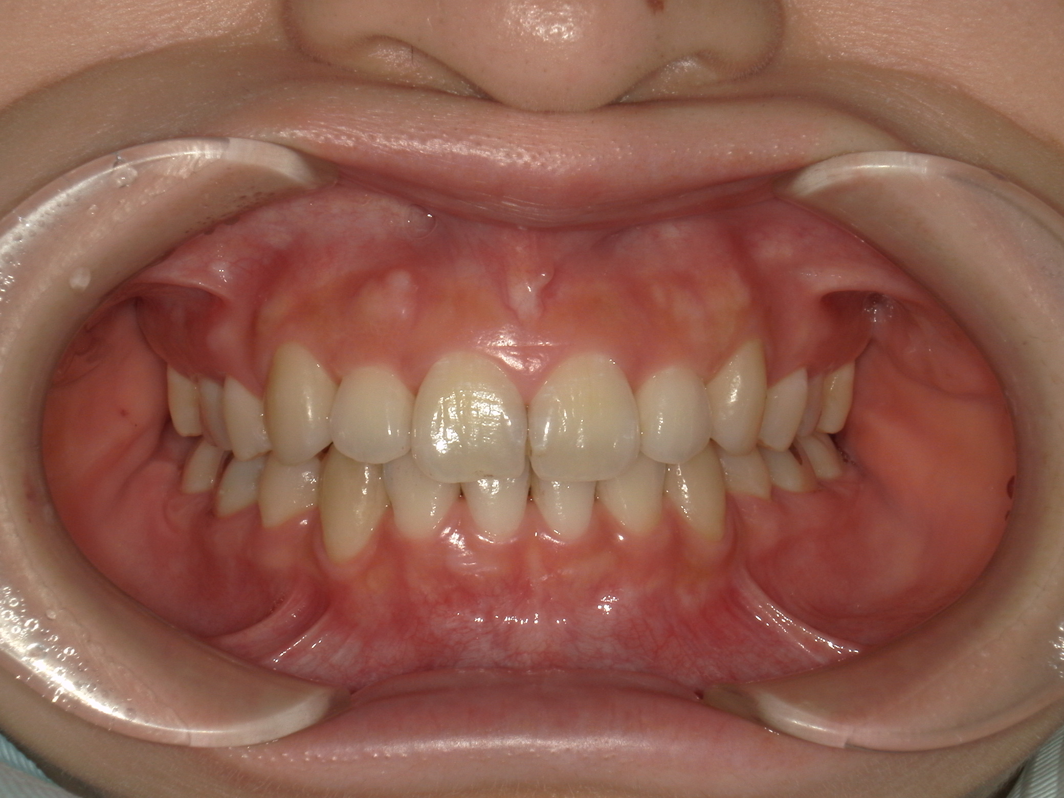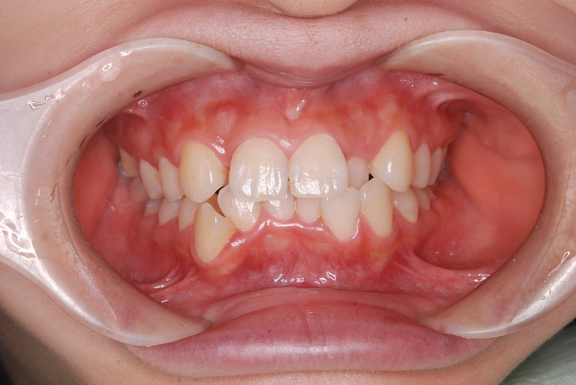 上下顎に叢生(歯並びのガタガタ) と部分的な反対咬合を認める。