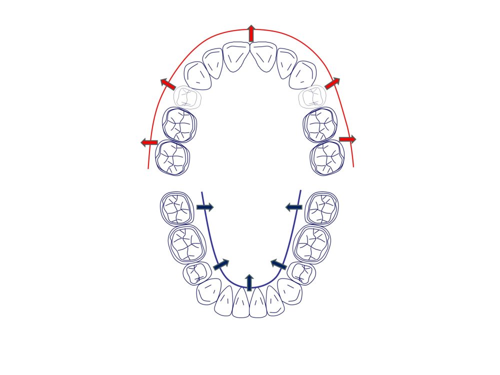 銀座矯正歯科では、30年近い歴史の中で5,000を超える裏側矯正またはハーフリンガル矯正の症例を手掛けてきました。私は、ハーフリンガル矯正は「単純に上を裏、下を表にすればよい」というものではないと考えています。下図に示すように表側矯正は外に拡大する動き、逆に裏側矯正は中に倒れる動きが自然に発生します。結果として、ハーフリンガルでは上顎のアーチが狭くなり、下顎のアーチが拡大するため咬頭対咬頭のかみ合わせが生じやすくなります。この点を理解し、解決する手段を持っていないとハーフリンガルは外傷性咬合を引き起こす原因になり得ます。
