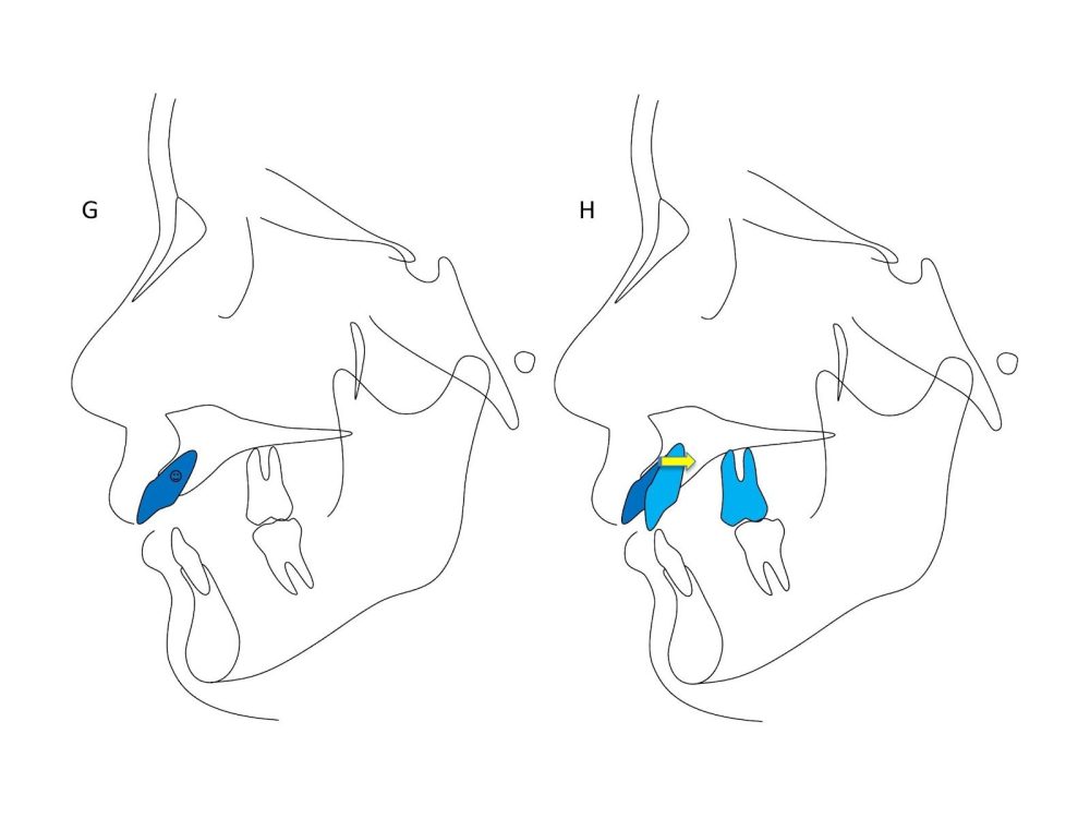 歯は自由に動かないことを説明してきましたが、抜歯矯正や奥歯の遠心移動(後方移動)を行う全顎的な治療であれば、以下のG→Hのように歯の抵抗中心を移動させる事が可能になります。つまり、歯根の位置を変化させない限り口元や横顔の印象を変えることは出来ません。矯正治療は歯冠ではなく歯根を動かすことが目的であると言えますね。