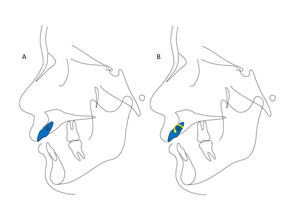 B:部分矯正では歯の移動に十分な隙間がないので、上顎前歯は「回転中心」を軸に歯は倒れ込みます。