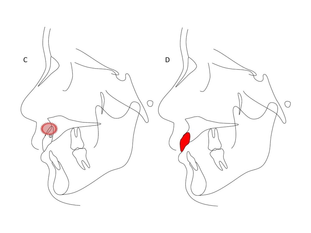 C:歯は裏側に倒れ込みますが、逆に歯根は表側に出てくる動きになるため硬い骨にぶつかればDのように歯根吸収が発生して歯根が短くなります。また、あるいは骨から歯根が出てくる動きになるので、歯茎が下がる歯肉退縮という矯正治療の副作用が現れる可能性が高まります。
