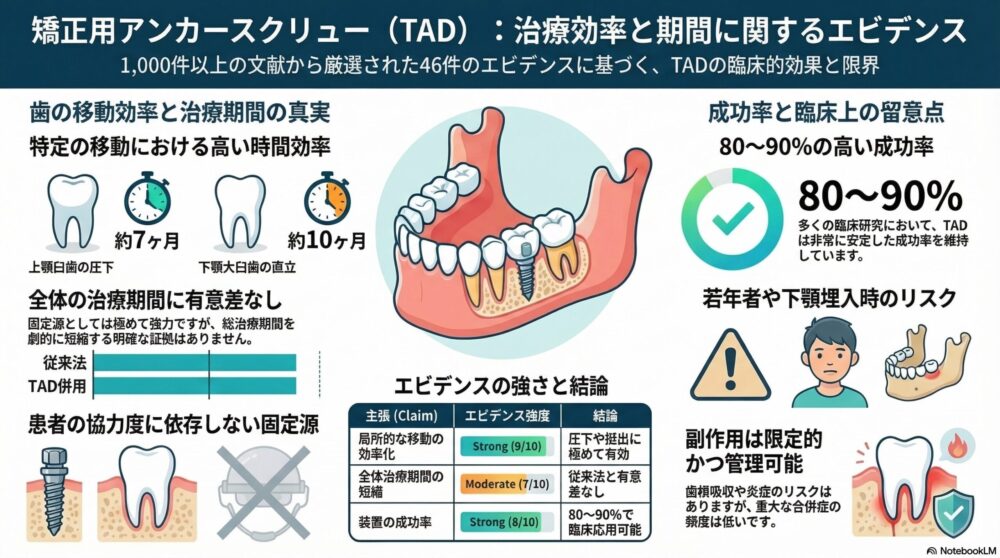 実際に複数の臨床研究をまとめたデータでも、アンカースクリューなどの外科的な固定源は、従来の方法と比べて全体の治療期間に有意な差をもたらさないと報告されています 。一部の研究では、最も強力な固定源であるにもかかわらず、従来の装置(Nanceのホールディングアーチなど)よりも総治療期間が長くなる傾向があったとする報告すらあります